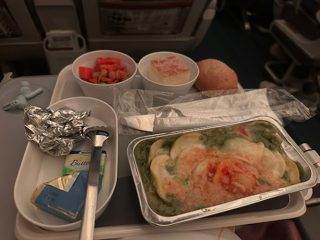Више места за ноге је бааааш значило, јер се наслониш уназад, исправиш ноге и скоро као и да лежиш, а поготово што испред мене на два места није било никога и онда сам ставио ногу на наслон између та два седишта (помало некултурно, али нико није био на тим седиштима). После првог јела смо заспали (иначе лет је полетео око 21.30, док смо полетели, ужинали и то све било је поноћ и тад смо заспали.